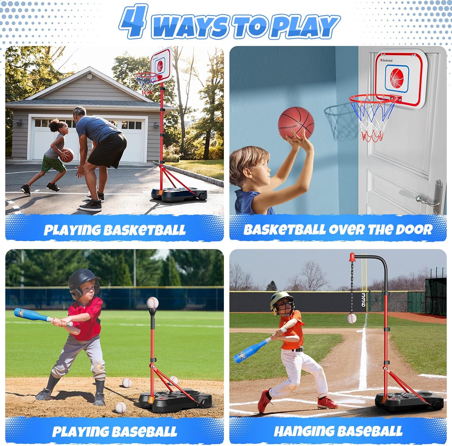 - Creative 4 modes: 1. Classic basketball, with adjustable basketball hoop and 2 mini basketballs, 2. Basketball over the door, suitable indoor play, but does not support dunks, 3. Switch to classic baseball mode, comes with 4 baseballs; 4. Hanging baseball, experience a fresh way of hitting the T-ball