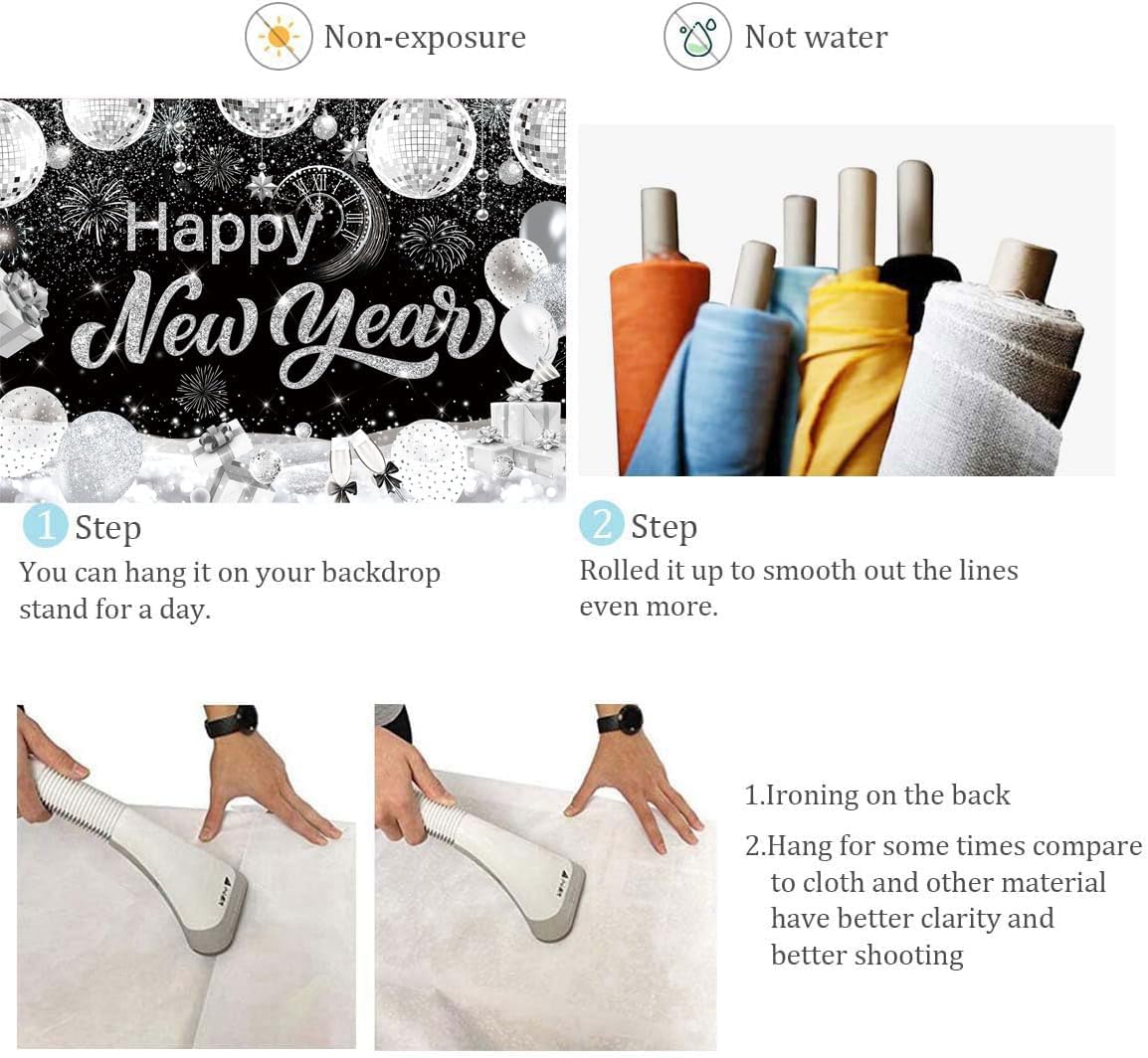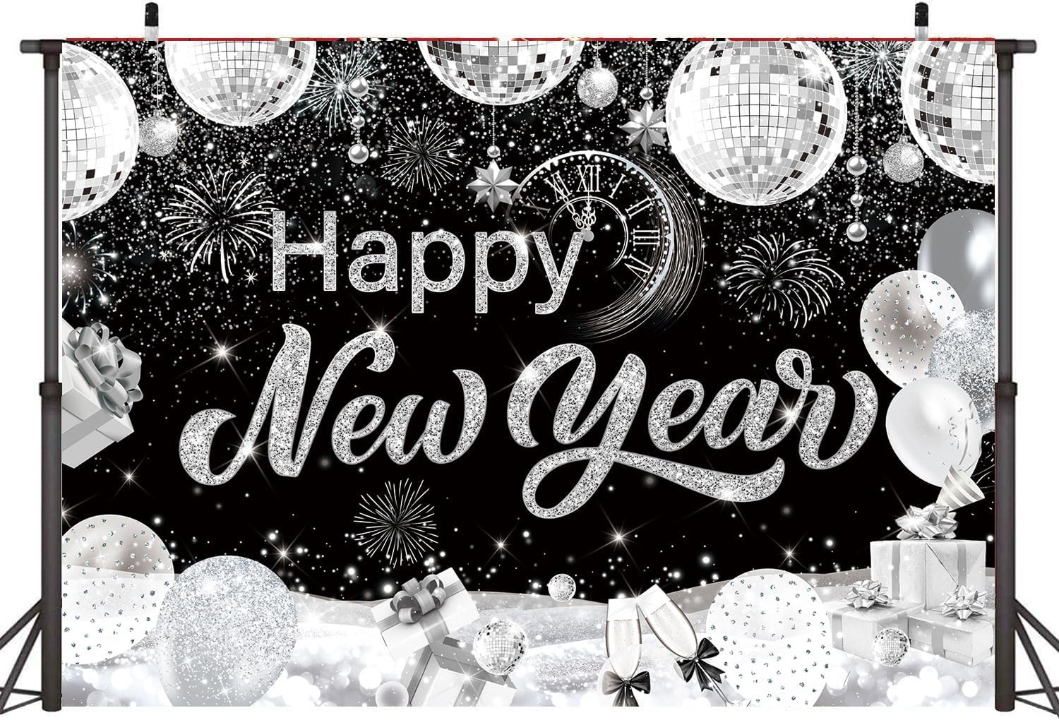 2026 Happy New Year Backdrop – 10x8 FT Black & Silver Photo Background with Fireworks & Champagne