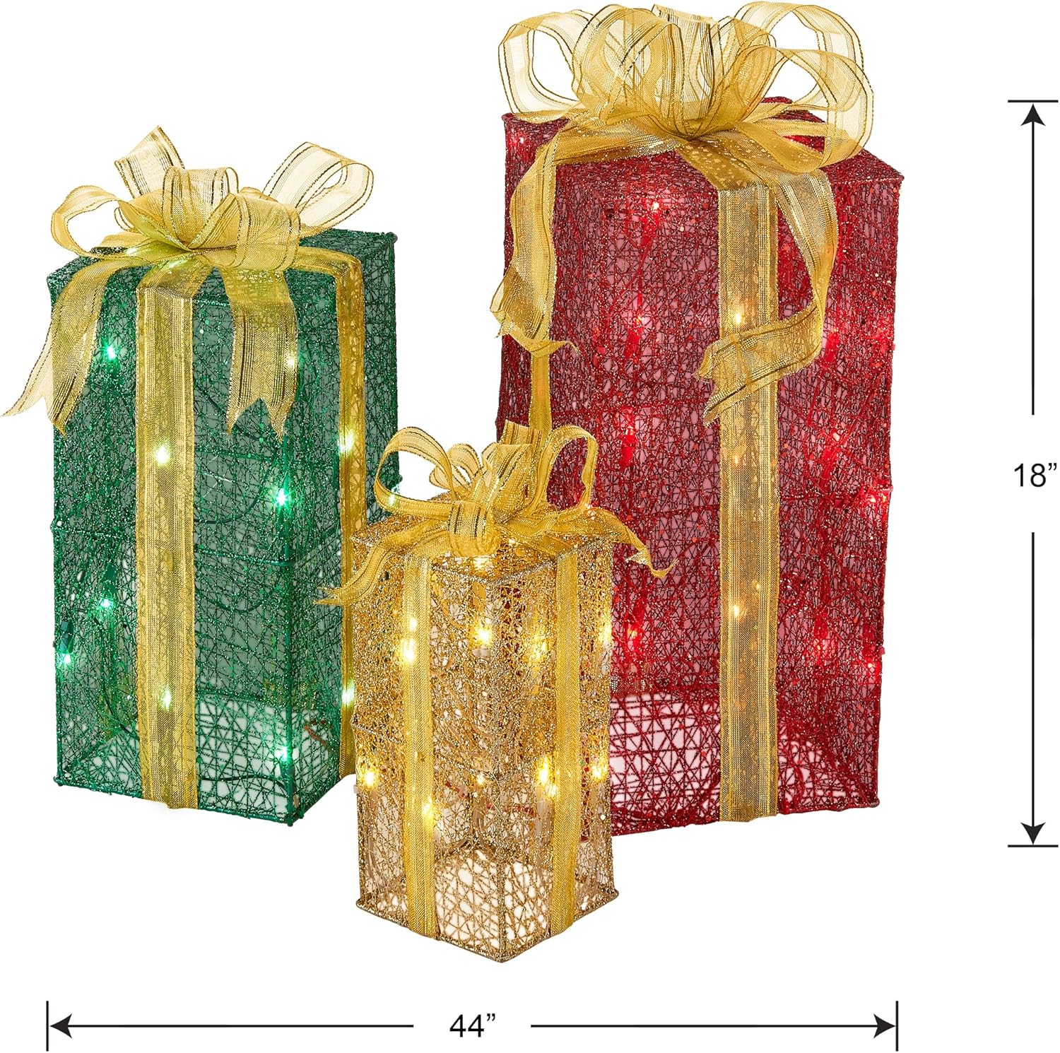 Add a touch of holiday charm with these eye-catching red, green, and golden gift boxes, beautifully wrapped in gold lace ribbons. Perfect for display in your yard, porch, living room, or any outdoor location.