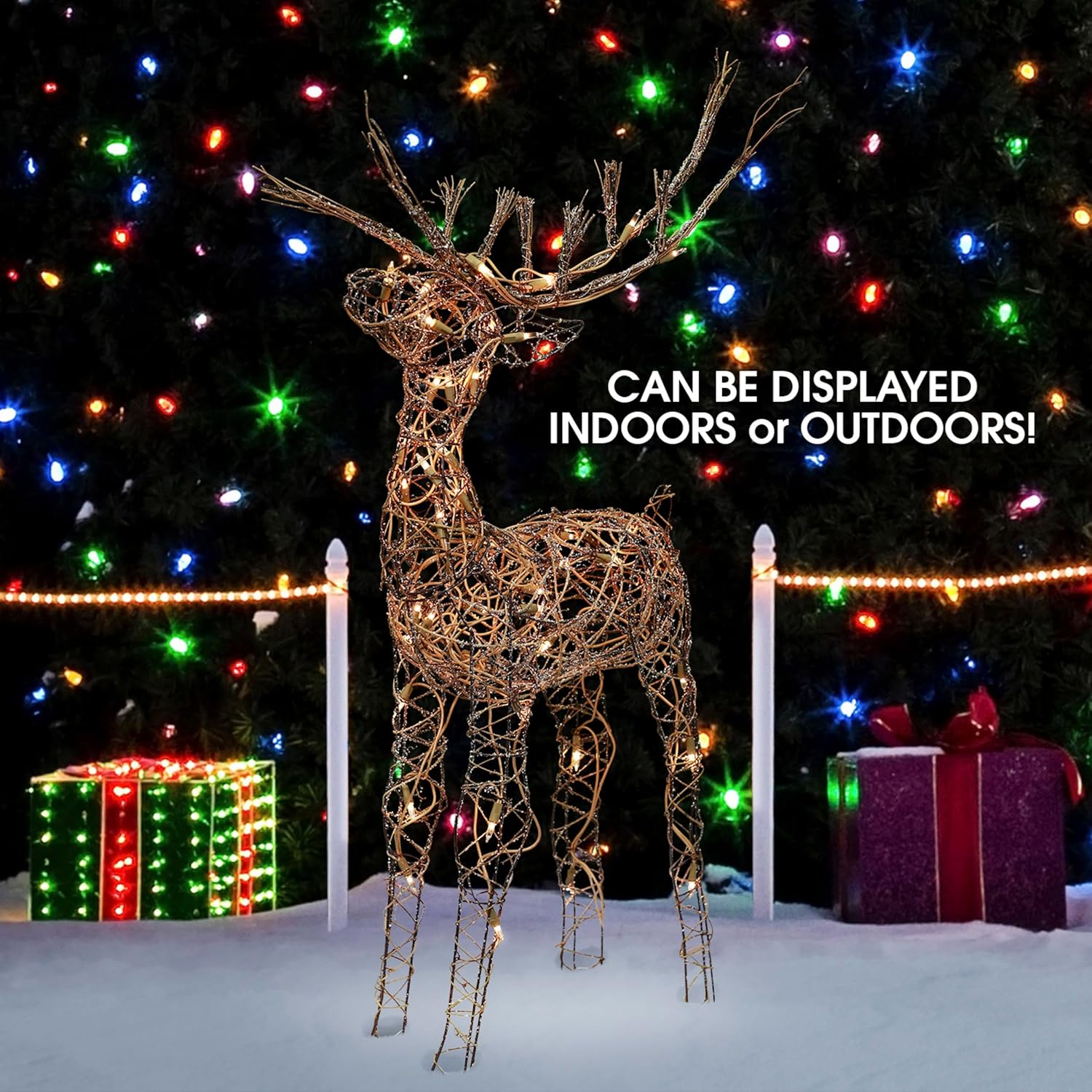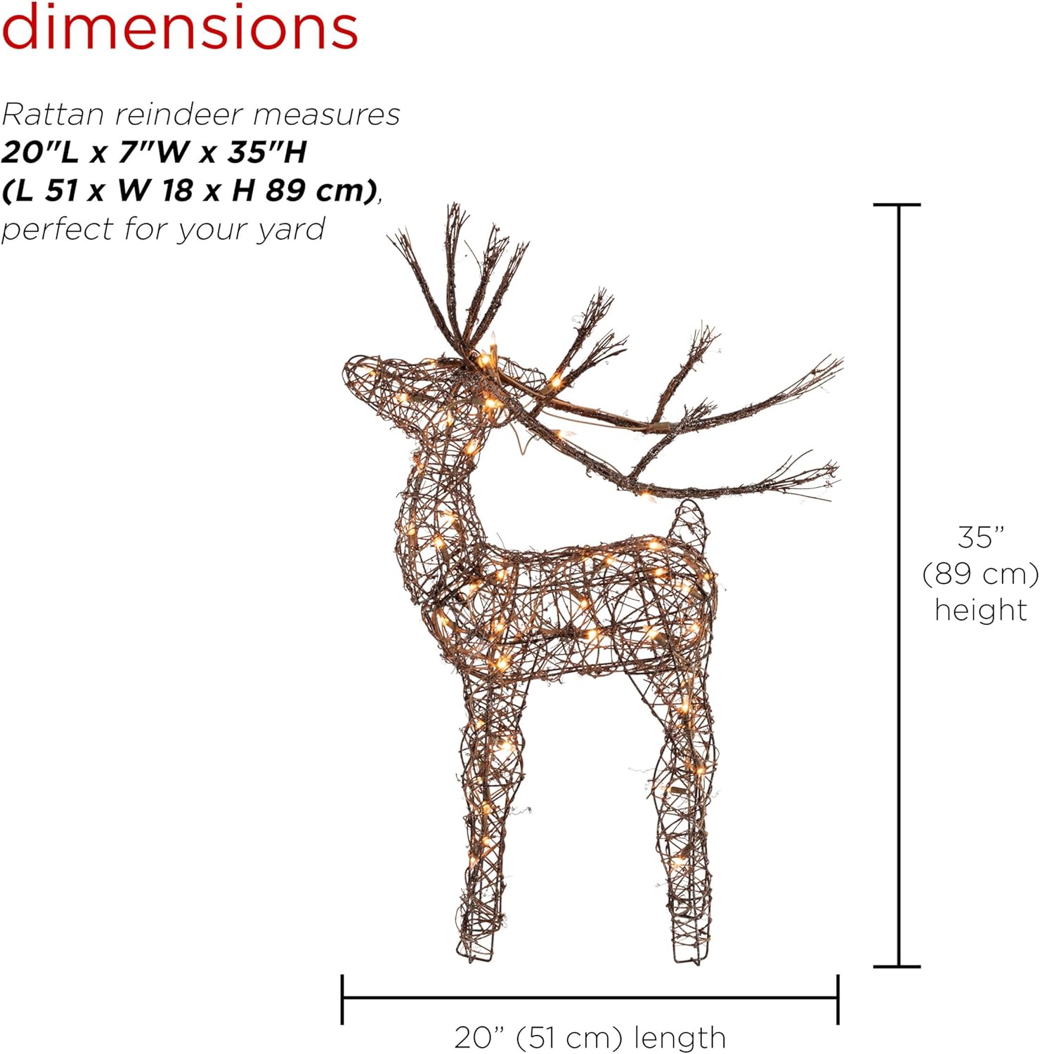 Standing at 35 inches tall, this rattan reindeer is designed to make a striking statement in your yard, perfect for celebrating the holiday season. -