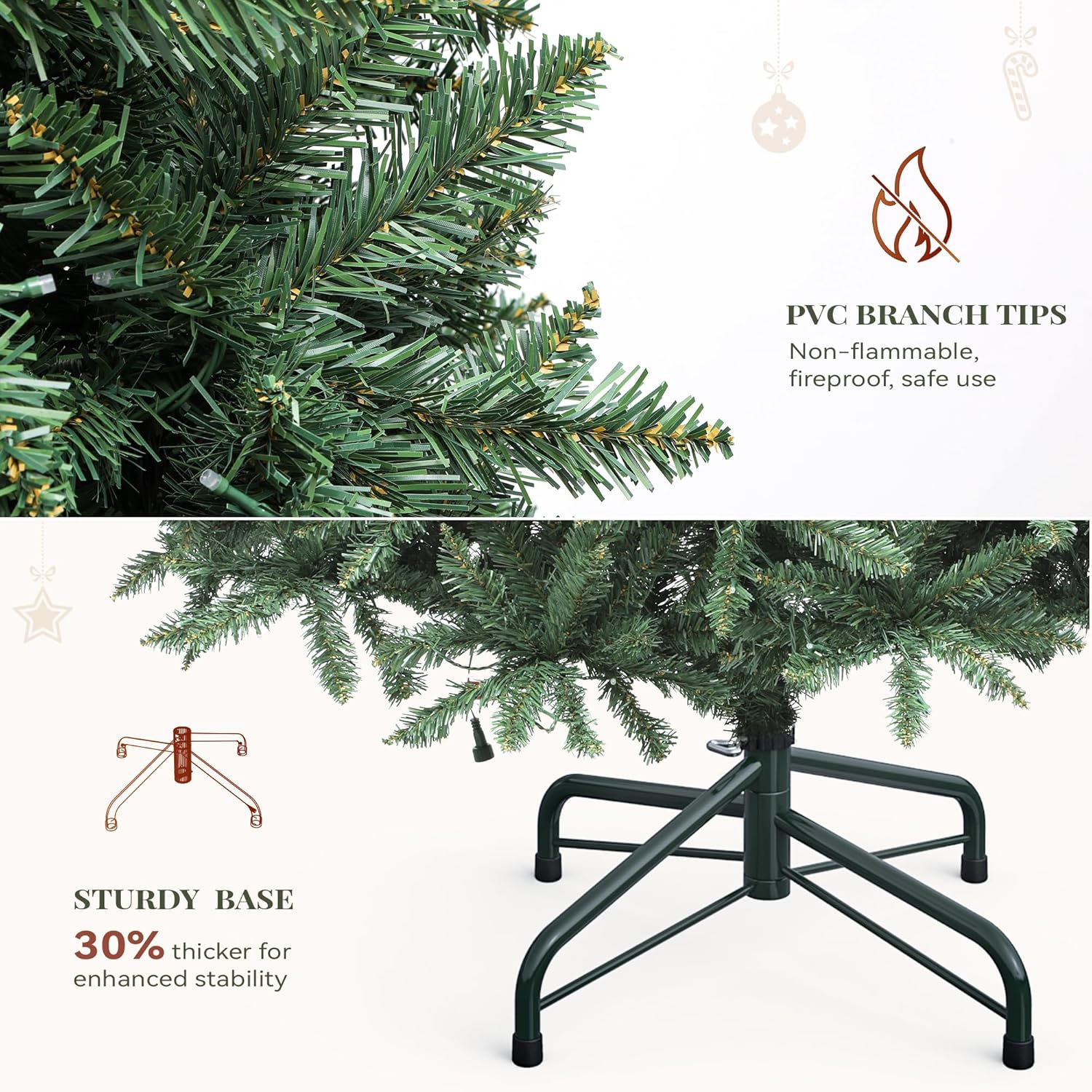 Featuring an X-shaped iron stand and reinforced base, this tree is built to last. Strong branches provide stability and support for your favorite ornaments, ensuring a reliable holiday centerpiece.