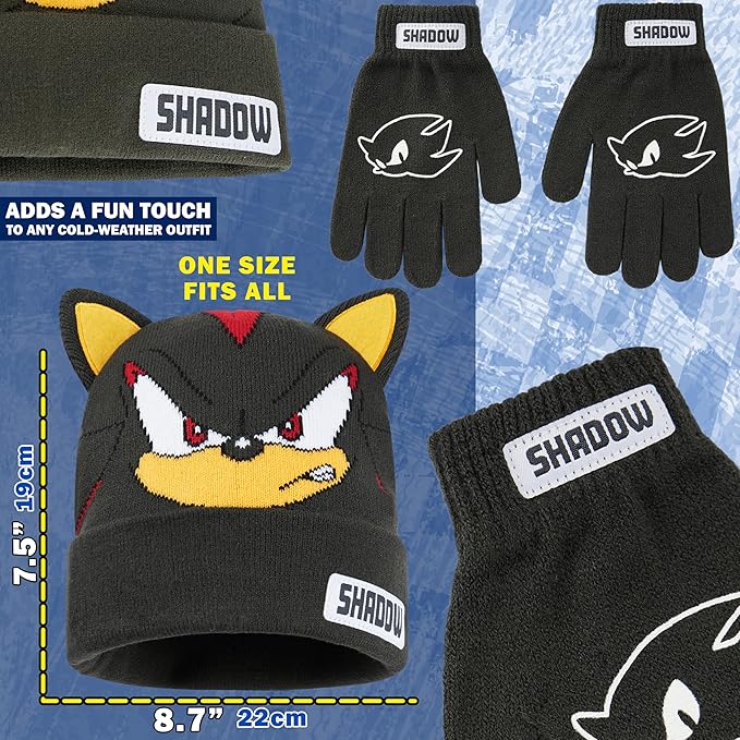 Playful Character Details: The beanie showcases 3D Sonic ears and embroidered accents, while matching gloves complete the fun themed look.