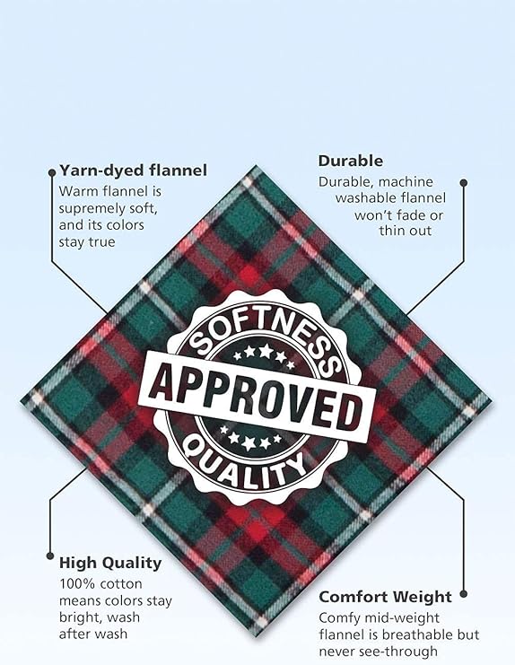 - Red/Green: Features red and green plaid pants with a coordinating evergreen long-sleeve, crew neck top.